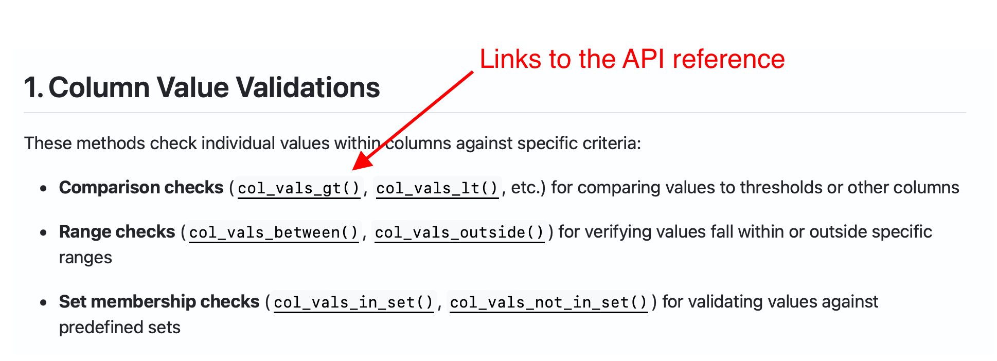 Compare the segments= parameter in the API Reference (e.g., look at col_vals_gt()) and the Segmentation article to get a feel for how each location documents the segments feature.